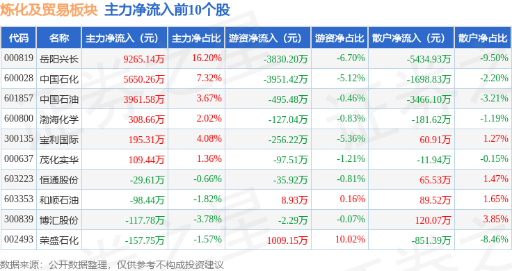 从资金流向上来看,当日炼化及贸易板块主力资金净流出1.05亿元,游资资金净流入1008.4万元,散户资金净流入9504.39万元。炼化及贸易板块个股资金流向见下表: