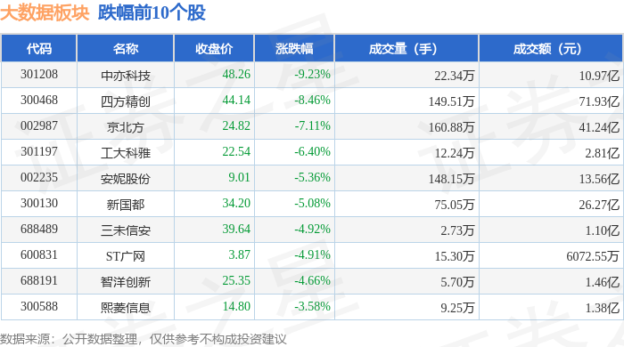 证券之星消息,7月10日大数据板块较上一交易日上涨0.05%,普联软件领涨。当日上证指数报收于3509.68,上涨0.48%。深证成指报收于10631.13,上涨0.47%。大数据板块个股涨跌见下表: