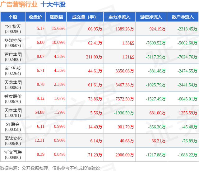 个股表现方面,广告营销行业当日领涨股为*ST紫天(300280),该股当日报收5.17,上涨15.66%,成交量66.95万,主力资金净流入1389.26万元。华媒控股(000607)以上涨10.09%紧随其后,该股当日成交量62.41万,主力资金净流入1.33亿元。除此之外,省广集团(002400)、新 华 都(002264)、天龙集团(300063)均进入当日牛股之列。具体个股列表见下表: