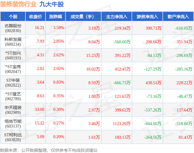 个股表现方面,装修装饰行业当日领涨股为名雕股份(002830),该股当日报收16.21,上涨3.58%,成交量3.19万,主力资金净流入219.34万元。科新发展(600234)以上涨2.85%紧随其后,该股当日成交量8.04万,主力资金净流出560.6万元。除此之外,*ST创兴(600193)、*ST宝鹰(002047)、ST中装(002822)均进入当日牛股之列。具体个股列表见下表: