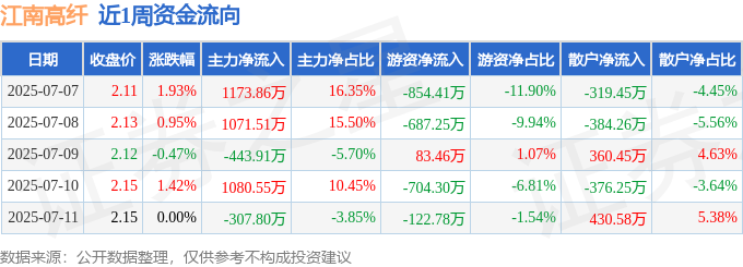 资金流向数据方面,本周江南高纤主力资金合计净流入2574.22万元,游资资金合计净流出2285.28万元,散户资金合计净流出288.94万元。本周资金流向一览见下表: