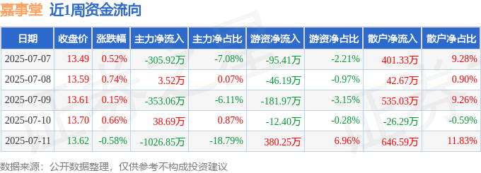 资金流向数据方面,本周嘉事堂主力资金合计净流出1643.62万元,游资资金合计净流入44.28万元,散户资金合计净流入1599.34万元。本周资金流向一览见下表: