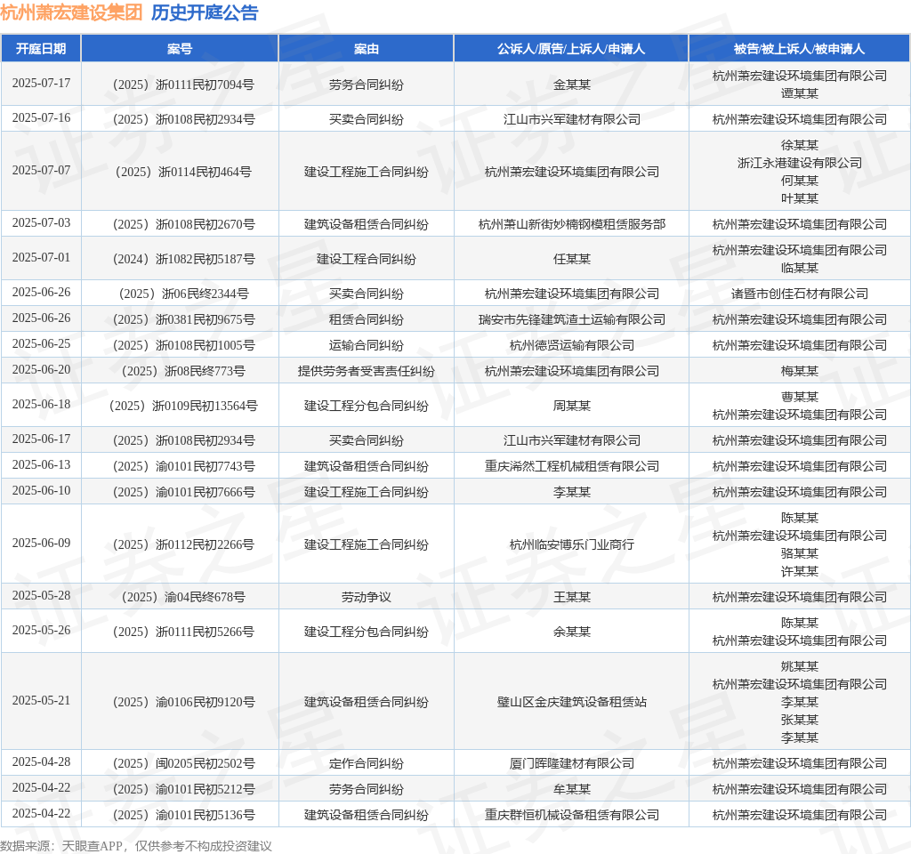 案号:(2025)浙0111民初7094号根据统计,近一年内以杭州萧宏建设环境集团有限公司为当事人的历史开庭公告有85则,其中案由为“买卖合同纠纷”的公告以11则居首,其次为“建筑设备租赁合同纠纷”有11则,“建设工程施工合同纠纷”有10则。历史开庭公告(前20条)如下: