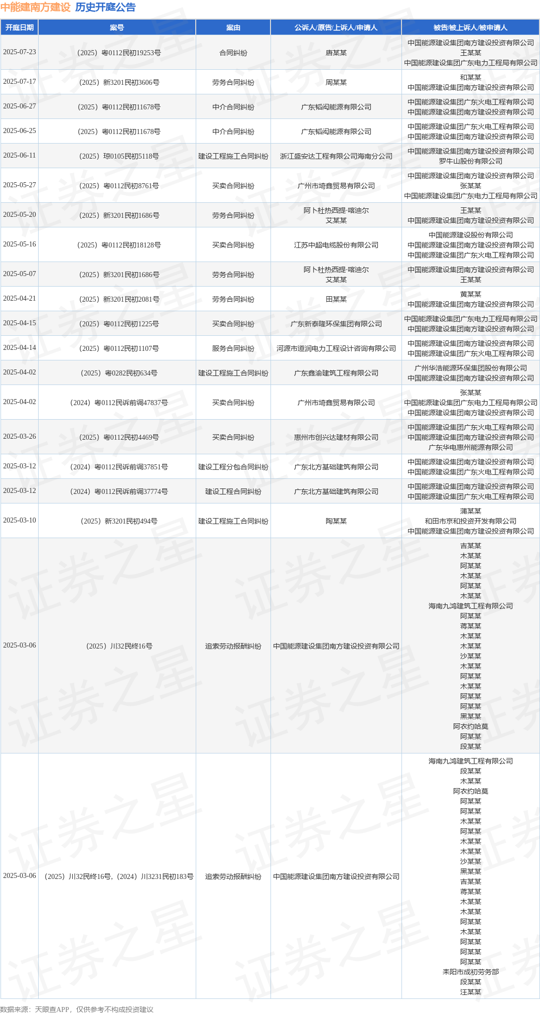 案号:(2025)新3201民初3606号根据统计,近一年内以中国能源建设集团南方建设投资有限公司为当事人的历史开庭公告有41则,其中案由为“买卖合同纠纷”的公告以20则居首,其次为“建设工程施工合同纠纷”有5则,“劳务合同纠纷”有4则。历史开庭公告(前20条)如下: