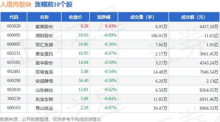 证券之星消息,7月15日人造肉板块较上一交易日下跌1.0%,唐人神领跌。当日上证指数报收于3505.0,下跌0.42%。深证成指报收于10744.56,上涨0.56%。人造肉板块个股涨跌见下表: