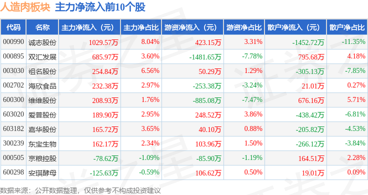 从资金流向上来看,当日人造肉板块主力资金净流出3.06亿元,游资资金净流入7121.69万元,散户资金净流入2.35亿元。人造肉板块个股资金流向见下表: