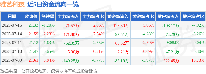 证券之星消息,截至2025年7月15日收盘,雅艺科技(301113)报收于21.33元,下跌1.2%,换手率2.14%,成交量1.18万手,成交额2502.52万元。