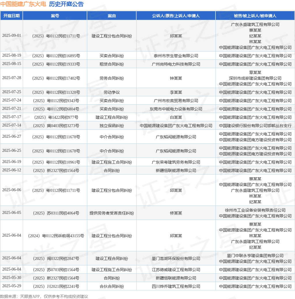 案号:(2025)粤1422民初977号根据统计,近一年内以中国能源建设集团广东火电工程有限公司为当事人的历史开庭公告有139则,其中案由为“买卖合同纠纷”的公告以47则居首,其次为“建设工程施工合同纠纷”有29则,“劳动争议”有10则。历史开庭公告(前20条)如下: