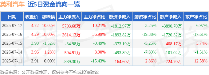 证券之星消息,英利汽车7月17日涨停收盘,收盘价4.72元。该股于13点53分涨停,1次打开涨停,截止收盘封单资金为1504.06万元,占其流通市值0.2%。