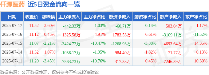 证券之星消息,截至2025年7月17日收盘,仟源医药(300254)报收于11.52元,上涨3.6%,换手率16.76%,成交量37.72万手,成交额4.3亿元。