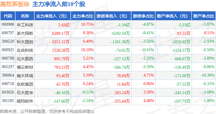 从资金流向上来看,当日高校系板块主力资金净流入2.46亿元,游资资金净流出1.7亿元,散户资金净流出7573.83万元。高校系板块个股资金流向见下表: