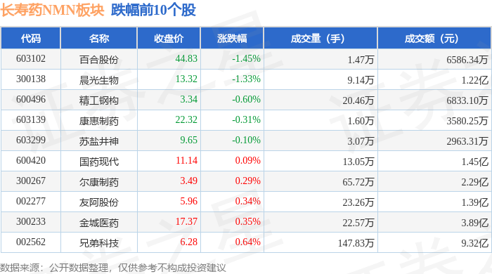 从资金流向上来看,当日长寿药NMN板块主力资金净流出579.3万元,游资资金净流出6743.14万元,散户资金净流入7322.44万元。长寿药NMN板块个股资金流向见下表: