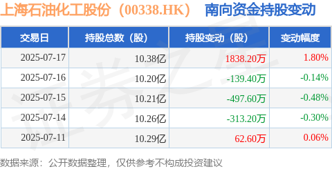 证券之星消息,7月17日南向资金增持1838.2万股上海石油化工股份(00338.HK)。近5个交易日中,获南向资金增持的有2天,累计净增持950.6万股。近20个交易日中,获南向资金减持的有14天,累计净减持4121.8万股。截至目前,南向资金持有上海石油化工股份(00338.HK)10.38亿股,占公司已发行普通股的32.3%。