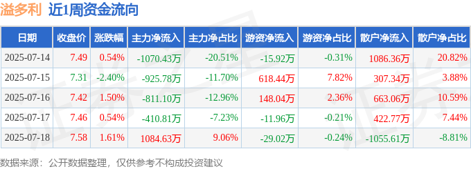资金流向数据方面,本周溢多利主力资金合计净流出2133.49万元,游资资金合计净流入709.57万元,散户资金合计净流入1423.91万元。本周资金流向一览见下表: