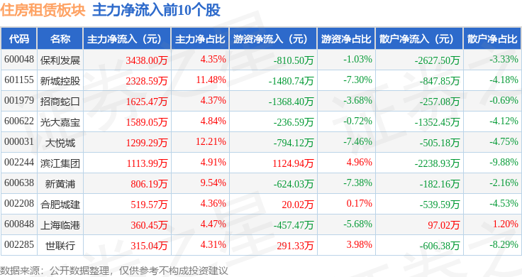 从资金流向上来看,当日住房租赁板块主力资金净流出2.08亿元,游资资金净流入9461.66万元,散户资金净流入1.13亿元。住房租赁板块个股资金流向见下表: