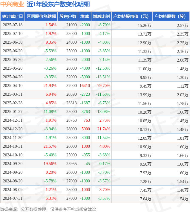 从股价来看,2025年7月10日至2025年7月18日,中兴商业区间涨幅为1.54%,在此期间股东户数减少2000.0户,减幅为8.7%。