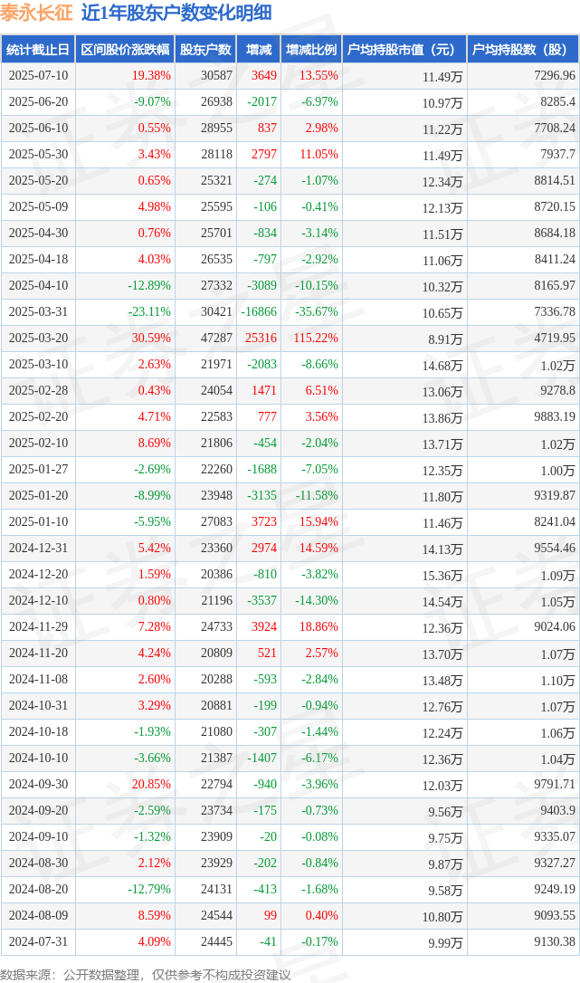 从股价来看,2025年6月20日至2025年7月10日,泰永长征区间涨幅为19.38%,在此期间股东户数增加3649.0户,增幅为13.55%。