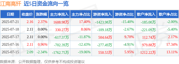 证券之星消息,截至2025年7月21日收盘,江南高纤(600527)报收于2.16元,上涨2.37%,换手率2.49%,成交量43.06万手,成交额9245.36万元。