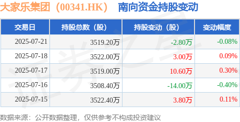 证券之星消息,7月21日南向资金减持2.8万股大家乐集团(00341.HK)。近5个交易日中,获南向资金增持的有3天,累计净增持6000.0股。近20个交易日中,获南向资金增持的有15天,累计净增持709.4万股。截至目前,南向资金持有大家乐集团(00341.HK)3519.2万股,占公司已发行普通股的6.06%。