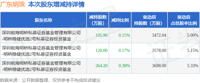 证券之星消息,7月22日广东明珠发布公告《广东明珠:广东明珠集团股份有限公司关于持股5%以上股东权益变动至5%的提示性公告》,其股东深圳前海明桥私募证券基金管理有限公司-明桥稳健优选2号私募证券投资基金于2025年7月15日至2025年7月22日间合计减持490.16万股,占公司目前总股本的0.7059%,变动期间该股股价下跌0.35%,截止7月22日收盘报5.63元。