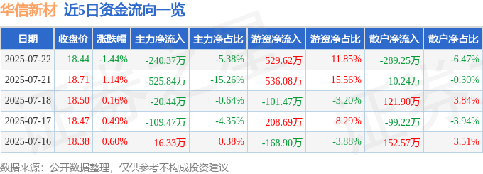 证券之星消息,截至2025年7月22日收盘,华信新材(300717)报收于18.44元,下跌1.44%,换手率2.37%,成交量2.41万手,成交额4468.23万元。