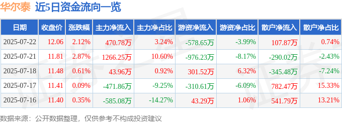 证券之星消息,截至2025年7月22日收盘,华尔泰(001217)报收于12.06元,上涨2.12%,换手率3.7%,成交量12.15万手,成交额1.45亿元。