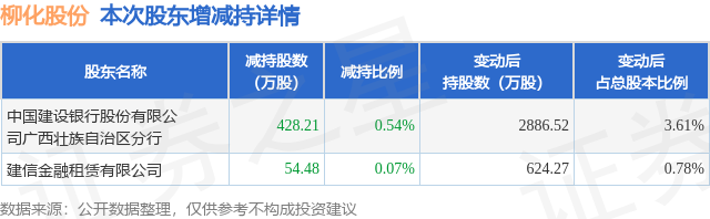证券之星消息,7月23日柳化股份发布公告《柳化股份:柳化股份合计持股5%以上股东减持股份结果公告》,其股东中国建设银行股份有限公司广西壮族自治区分行、建信金融租赁有限公司于2025年7月5日至2025年7月23日间合计减持482.69万股,占公司目前总股本的0.6043%,变动期间该股股价上涨3.77%,截止7月23日收盘报3.85元。