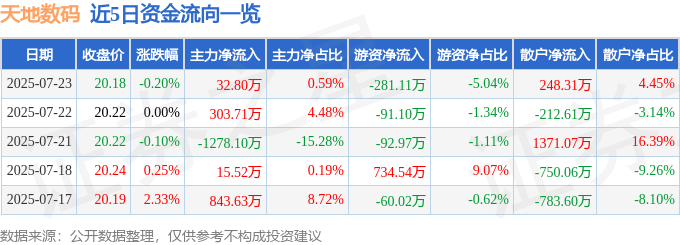 证券之星消息,截至2025年7月23日收盘,天地数码(300743)报收于20.18元,下跌0.2%,换手率2.17%,成交量2.77万手,成交额5576.95万元。