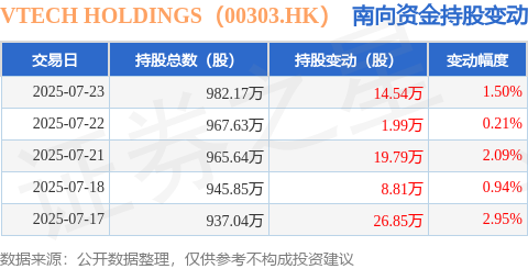 证券之星消息,7月23日南向资金增持14.54万股VTECH HOLDINGS(00303.HK)。近5个交易日中,获南向资金增持的有5天,累计净增持71.98万股。近20个交易日中,获南向资金增持的有18天,累计净增持233.54万股。截至目前,南向资金持有VTECH HOLDINGS(00303.HK)982.17万股,占公司已发行普通股的3.88%。