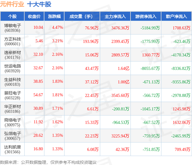 个股表现方面,元件行业当日领涨股为博敏电子(603936),该股当日报收10.04,上涨4.47%,成交量76.96万,主力资金净流入3476.36万元。方正科技(600601)以上涨3.21%紧随其后,该股当日成交量193.96万,主力资金净流入2399.45万元。除此之外,逸豪新材(301176)、世运电路(603920)、生益科技(600183)均进入当日牛股之列。具体个股列表见下表: