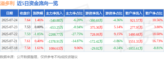7月24日的资金流向数据方面,主力资金净流出540.88万元,占总成交额6.2%,游资资金净流出380.69万元,占总成交额4.36%,散户资金净流入921.57万元,占总成交额10.56%。