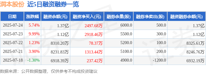 润本股份融资融券信息显示,融资方面,当日融资买入1.09亿元,融资偿还8362.11万元,融资净买入2497.68万元,连续3日净买入累计5494.51万元。融券方面,融券卖出1000.0股,融券偿还500.0股,融券余量6000.0股,融券余额20.68万元。融资融券余额1.37亿元。