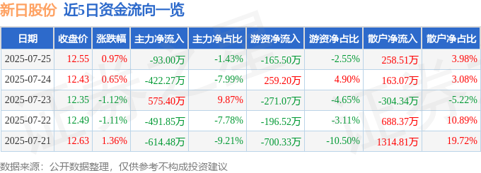 证券之星消息,截至2025年7月25日收盘,新日股份(603787)报收于12.55元,上涨0.97%,换手率2.26%,成交量5.19万手,成交额6500.18万元。