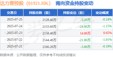 证券之星消息,7月25日南向资金减持5.2万股达力普控股(01921.HK)。近5个交易日中,获南向资金减持的有4天,累计净减持41.6万股。近20个交易日中,获南向资金增持的有7天,累计净增持11.8万股。截至目前,南向资金持有达力普控股(01921.HK)2128.4万股,占公司已发行普通股的1.4%。
