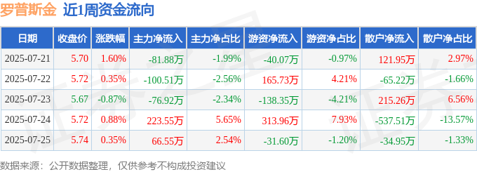 资金流向数据方面,本周罗普斯金主力资金合计净流入30.79万元,游资资金合计净流入269.68万元,散户资金合计净流出300.47万元。本周资金流向一览见下表: