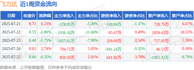 资金流向数据方面,本周飞力达主力资金合计净流出1927.44万元,游资资金合计净流入76.1万元,散户资金合计净流入1851.34万元。本周资金流向一览见下表: