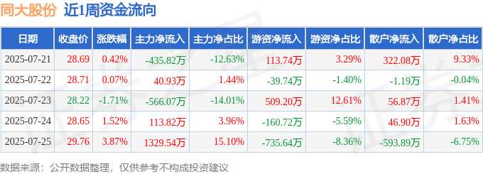 资金流向数据方面,本周同大股份主力资金合计净流入482.39万元,游资资金合计净流出313.16万元,散户资金合计净流出169.23万元。本周资金流向一览见下表: