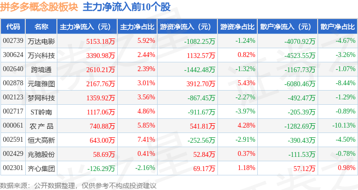 从资金流向上来看,当日拼多多概念股板块主力资金净流出4.98亿元,游资资金净流入2.62亿元,散户资金净流入2.36亿元。拼多多概念股板块个股资金流向见下表: