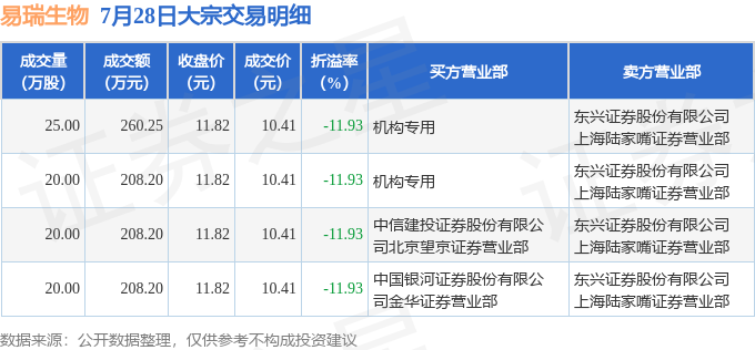 证券之星消息,7月28日易瑞生物发生大宗交易,交易数据如下: