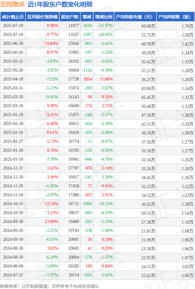 从股价来看,2025年7月10日至2025年7月18日,亚翔集成区间涨幅为8.96%,在此期间股东户数减少1620.0户,减幅为11.97%。