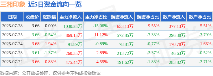 证券之星消息,截至2025年7月28日收盘,三湘印象(000863)报收于3.66元,上涨0.0%,换手率1.61%,成交量18.72万手,成交额6841.25万元。