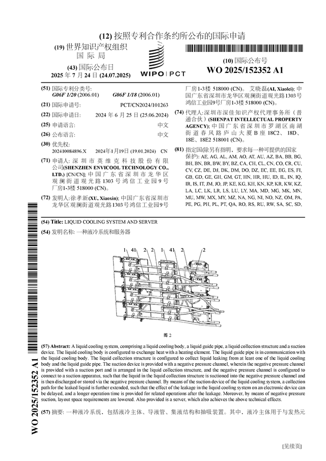 证券之星消息,根据企查查数据显示英维克(002837)公布了一项国际专利申请,专利名为“一种液冷系统和服务器”,专利申请号为PCT/CN2024/101263,国际公布日为2025年7月24日。