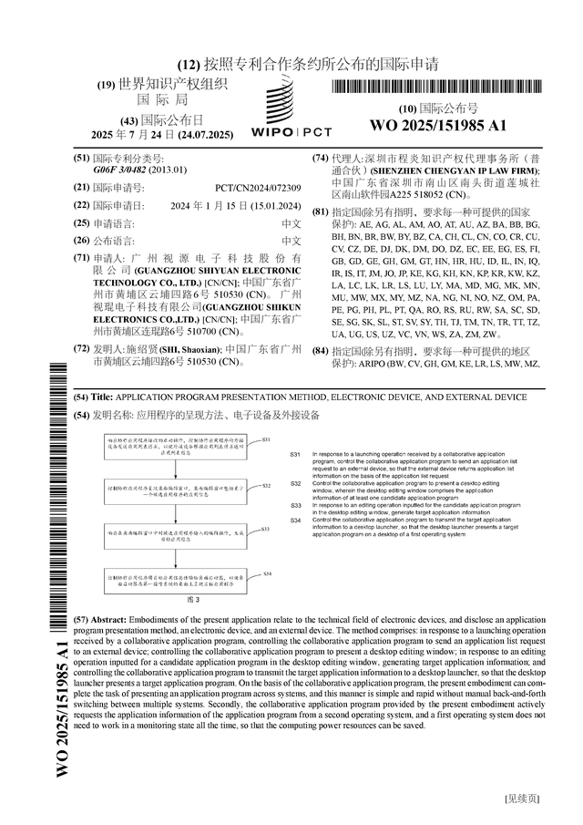 证券之星消息,根据企查查数据显示视源股份(002841)公布了一项国际专利申请,专利名为“应用程序的呈现方法、电子设备及外接设备”,专利申请号为PCT/CN2024/072309,国际公布日为2025年7月24日。
