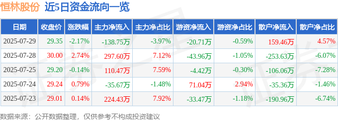 证券之星消息,截至2025年7月29日收盘,恒林股份(603661)报收于29.35元,下跌2.17%,换手率0.85%,成交量1.18万手,成交额3492.14万元。