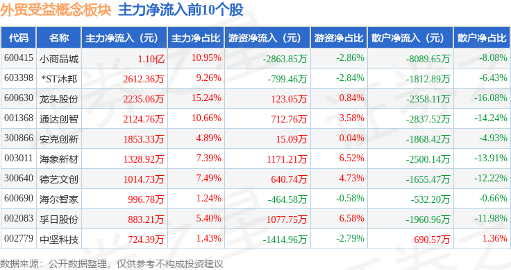 从资金流向上来看,当日外贸受益概念板块主力资金净流出9.8亿元,游资资金净流入1.97亿元,散户资金净流入7.82亿元。外贸受益概念板块个股资金流向见下表: