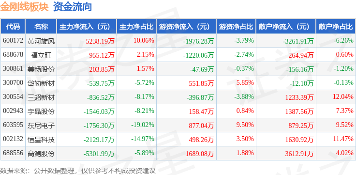 从资金流向上来看,当日金刚线板块主力资金净流出5712.6万元,游资资金净流入133.79万元,散户资金净流入5578.81万元。金刚线板块个股资金流向见下表: