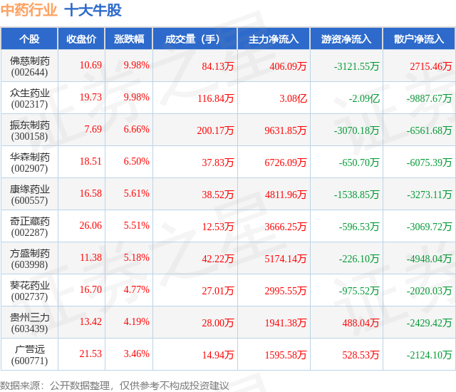 个股表现方面,中药行业当日领涨股为佛慈制药(002644),该股当日报收10.69,上涨9.98%,成交量84.13万,主力资金净流入406.09万元。众生药业(002317)以上涨9.98%紧随其后,该股当日成交量116.84万,主力资金净流入3.08亿元。除此之外,振东制药(300158)、华森制药(002907)、康缘药业(600557)均进入当日牛股之列。具体个股列表见下表: