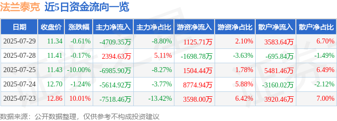证券之星消息,截至2025年7月29日收盘,法兰泰克(603966)报收于11.34元,下跌0.61%,换手率11.96%,成交量47.56万手,成交额5.35亿元。