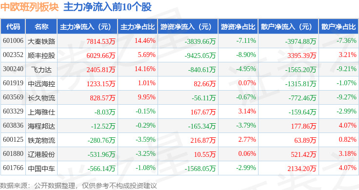 从资金流向上来看,当日中欧班列板块主力资金净流出6953.35万元,游资资金净流出8673.72万元,散户资金净流入1.56亿元。中欧班列板块个股资金流向见下表: