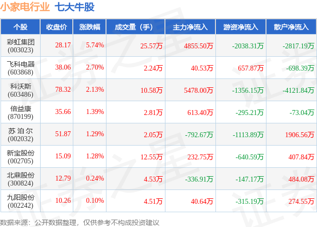 个股表现方面,小家电行业当日领涨股为彩虹集团(003023),该股当日报收28.17,上涨5.74%,成交量25.57万,主力资金净流入4855.5万元。飞科电器(603868)以上涨2.7%紧随其后,该股当日成交量2.24万,主力资金净流入40.53万元。除此之外,科沃斯(603486)、倍益康(870199)、苏 泊 尔(002032)均进入当日牛股之列。具体个股列表见下表: